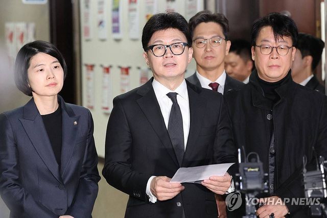 국민의힘 한동훈 대표가 지난 7일 밤 서울 여의도 국회에서 윤석열 대통령 탄핵소추안 표결 무산 뒤 입장을 밝히고 있다 / 연합뉴스