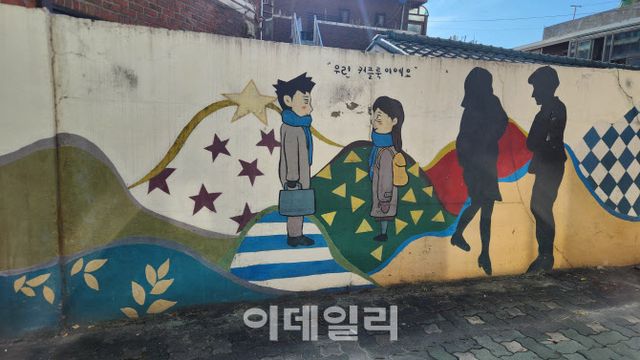 예를 들어 ‘행복의 나라로’라는 벽화는 원작 ‘당신을 사랑합니다’ 속 만석 할아버지와 송이 할머니가 턱시도와 웨딩드레스를 입고 멋진 오토바이를 탄 채 달려가는 모습이 그려져 있다. 사실 이들은 원작에서는 서로 추억만 간직한 채 끝내 이어지지 못했다.