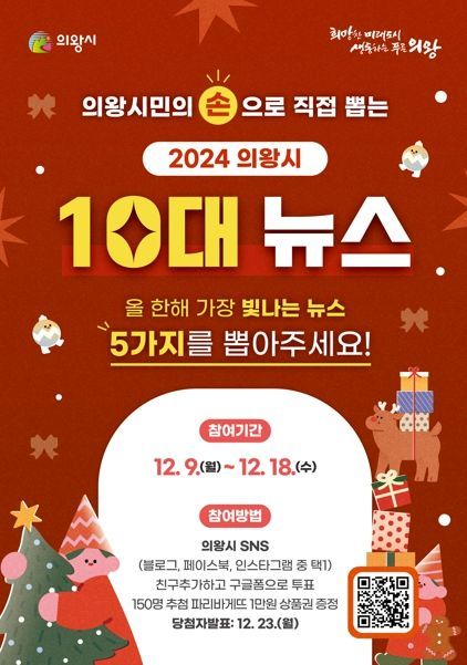 시는 득표수가 높은 10건의 뉴스를 ‘2024년 의왕시 10대뉴스’로 선정해 오는 23일 시 홈페이지와 SNS 등을 통해 결과를 발표할 예정이다.