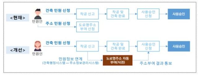 행정안전부와 국토교통부는 건축물 신축 시 착공 신고가 완료되면 건축주가 신청하지 않아도 지자체가 알아서 도로명주소를 부여하도록 업무절차 및 시스템 개선을 완료했다.