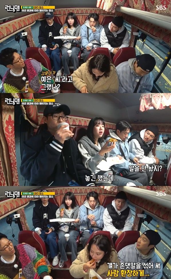 차로 이동하는 가운데, 김종국은 "예은 씨는 적응 잘 하고 있어요?"라고 강훈의 말투를 따라 하더니 "(강훈과) 말을 놨냐"고 물었다. 말을 놓았다는 지예은의 말에 하하는 "걔가 사람 환장하게 존댓말을 섞어 쓴다"고 강훈의 반존대 화법을 언급했다.