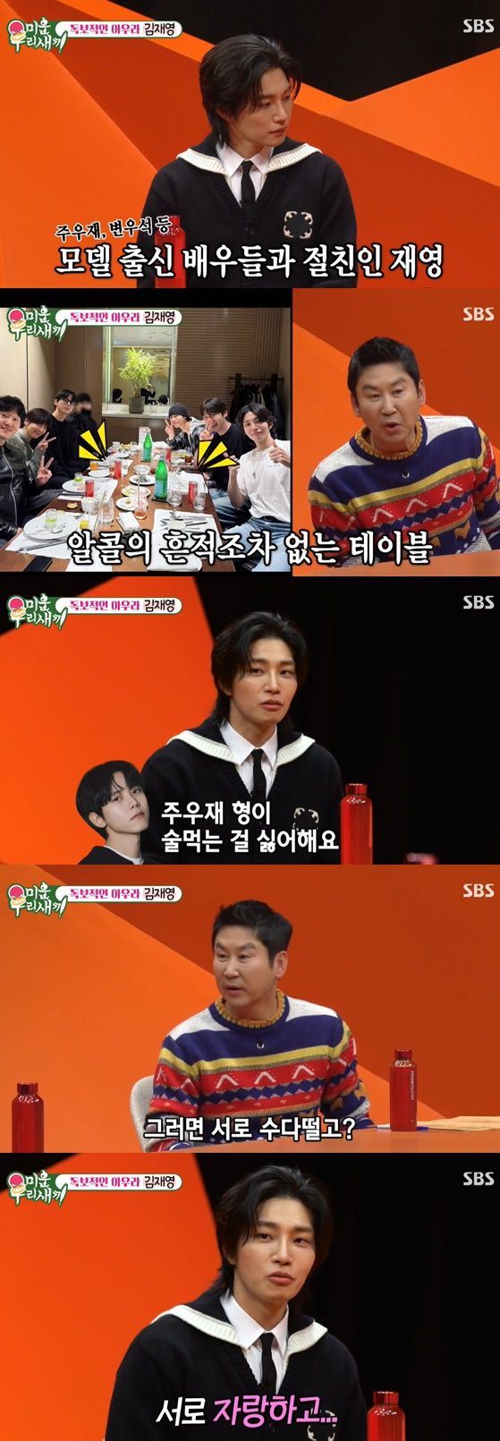 사진 속 테이블 위에는 알코올이 전혀 보이지 않아 눈길을 끌었다. 이에 김재영은 "주우재 형이 술 먹는 걸 싫어한다. 그래서 모이면 잘 안 먹게 된다"고 밝히더니 "모이면 서로 자랑한다"고 말해 웃음을 자아냈다.