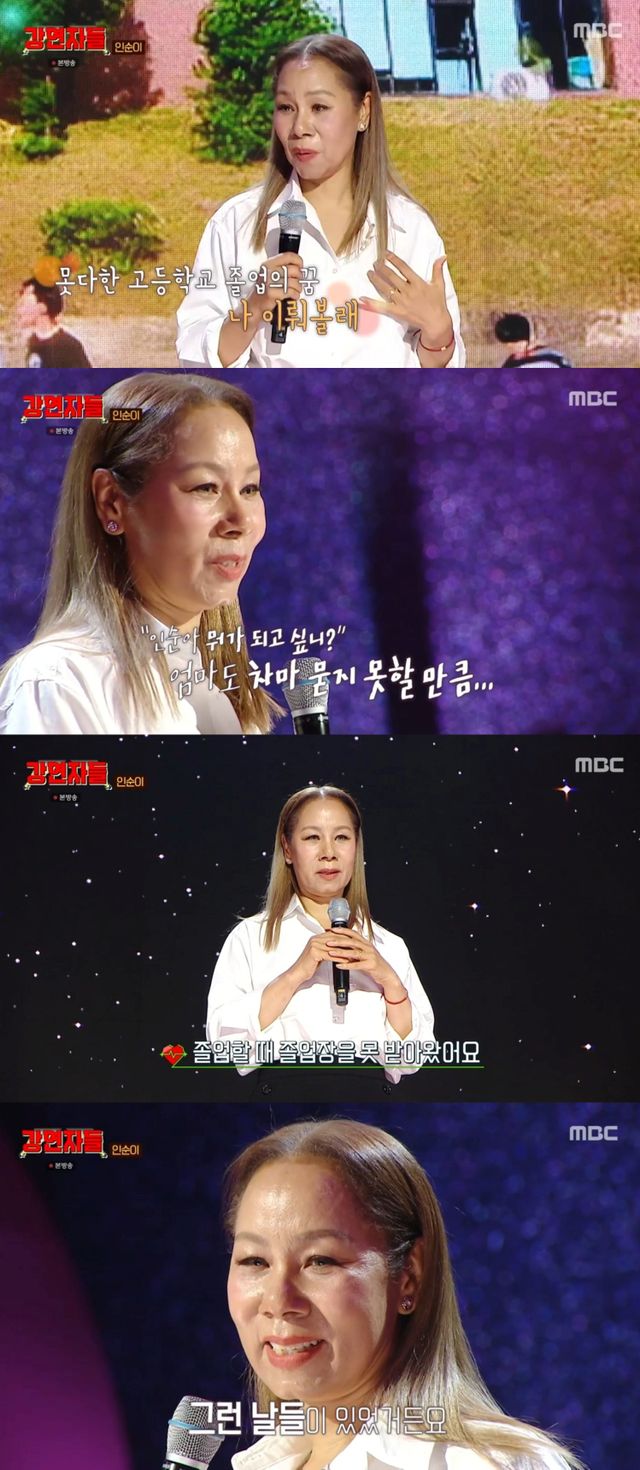 형편이 어려웠던 어린 시절을 회상한 인순이는 "그때 상황은 어쩌지 못하는 상황이었다. 엄마도 저한테 '뭐가 되고 싶니?'라고 물어볼 수 없는 입장이었다"며 "사실 중학교 졸업장도 육성회비를 못 내서 졸업할 때는 졸업장을 못 받았다. 몇 달 동안 모은 돈으로 중학교 졸업장을 찾아왔다"고 털어놨다.