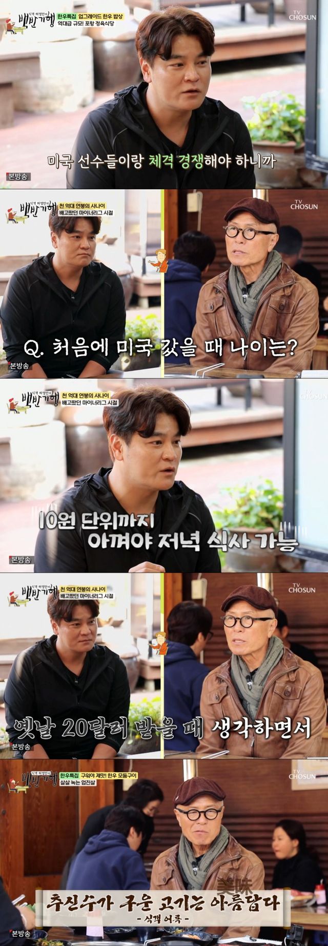 허영만의 질문에 18살에 미국으로 갔다고 밝힌 추신수는 7년 동안 마이너리그 생활을 했다고 덧붙였다. 당시 연봉에 대해 추신수는 "제일 낮은 레벨은 월급 자체가 없었다. 밥값만 하루에 2만 원이 나왔다. 아침은 호텔에서 주지만 점심 때 10원까지 아껴야 저녁을 먹을 수 있었다. 항상 계획 있게 생활했다"고 솔직하게 털어놨다.