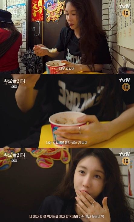 재료를 다 섞어서 맛본 이지아는 "나는 맛있으면 혼자 웃는 거 같다. 나 혼자 밥 잘 먹는다. 혼자 밥 먹으러 가서 막 혼자 웃는다"고 혼밥을 자주 즐긴다고 밝혔다.