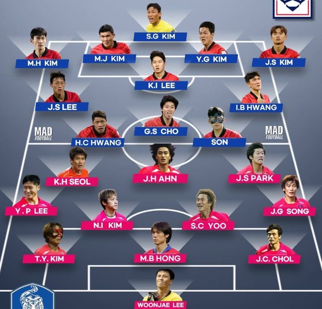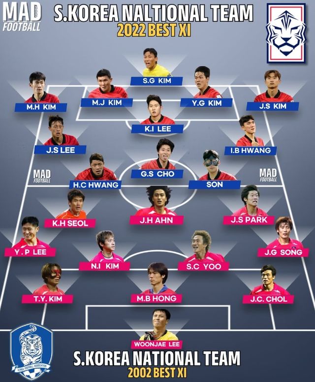글로벌 매체 '매드 풋볼'은 8일(한국시간) 사회관계망서비스(SNS)를 통해 '대한민국 2002 베스트 11 VS 대한민국 2022 베스트 11'이라는 제목으로 한 장의 사진을 게시했다.