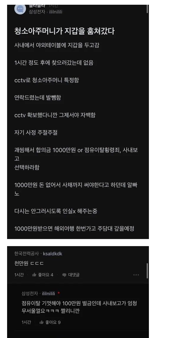 청소 아주머니가 지갑을 훔쳐갔다.