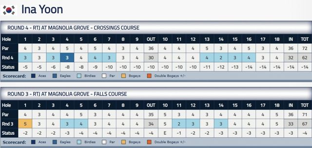 윤이나는 이날 CC에서 보기 없이 이글 1개, 버디 8개로 10타를 몰아쳐 합계 14언더파 272타로 전날 공동 16위에서 공동 7위로 껑충 뛰었다. 선두와 타수 차를 6타로 줄였다.