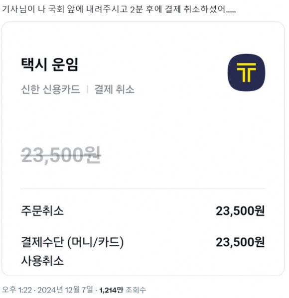 이날 엑스(X·옛 트위터) 이용자 A씨는 “기사님이 나 국회 앞에 내려주시고 2분 후에 결제 취소하셨다”며 택시비 결제 취소 내역을 캡처해 게재했다.