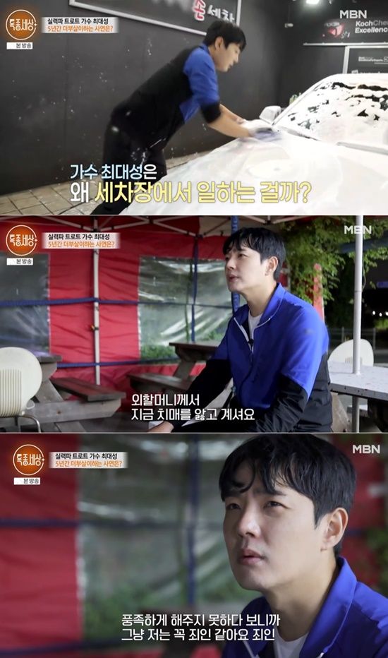 완벽한 수트핏의 화려하고 고급스러운 이미지로 많은 사랑받는 최대성인데, '특종세상' 속 그는 아르바이트를 하는 무명 가수의 일상을 적나라하게 그려낸 것. 국내 내로라하는 가요제 대상 올킬, 어느덧 7년차 트로트 가수로 활약 중인 그가 짬날 때면 세차장에서 아르바이트를 하는가 하면 회사 이사의 집에서 5년째 더부살이 중인 사실이 밝혀져 충격을 자아냈다.