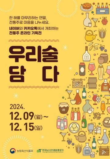 [와이뉴스] 농림축산식품부와 한국농수산식품유통공사는 12월 9일부터 15일까지 7일간 다양한 전통주를 알리고 소비를 활성화하기 위한 전통주 기획전인 ‘우리술담다’를 네이버쇼핑과 카카오톡 선물하기에서 개최한다.