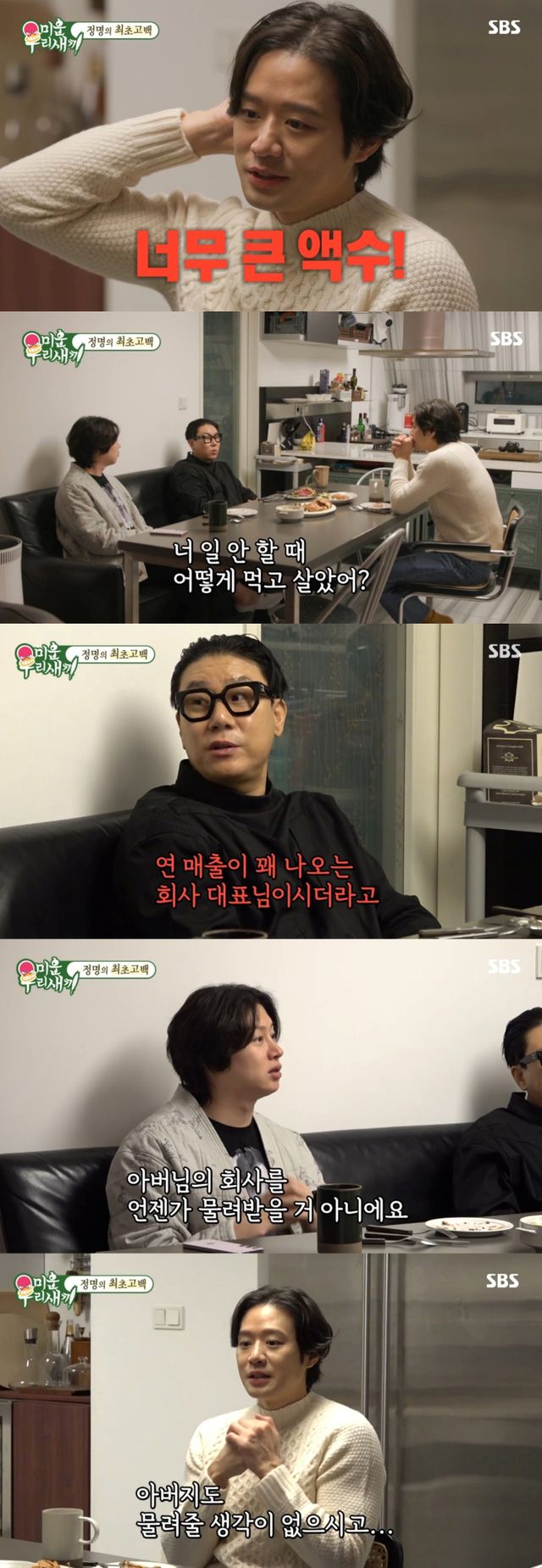버는 돈의 90%를 저축했다고 알린 천정명은 부모님께 배웠다고 말을 이었고, 이를 들은 이상민은 "아버지가 연 매출이 꽤 나오는 회사의 대표님이시더라"고 말해 김희철의 헛웃음을 유발했다.