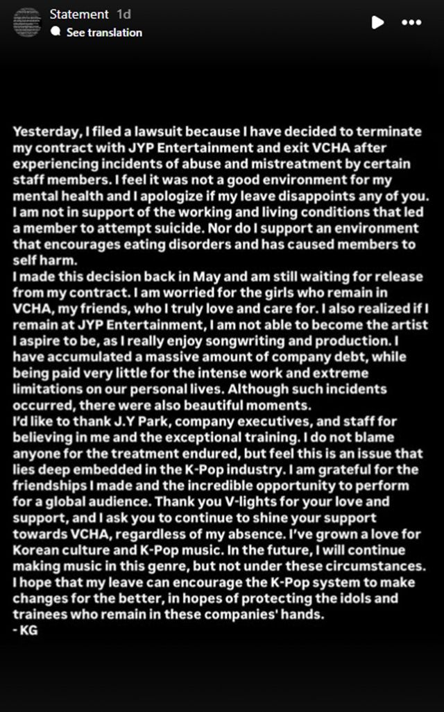 저와 탁월한 훈련을 믿어주신 박제이, 회사 경영진, 직원 여러분께 감사드립니다. 견뎌낸 대우에 대해 누구를 탓하지는 않지만, 이 문제는 K-Pop 업계에 깊숙이 자리 잡은 문제라고 생각합니다. 제가 맺은 우정과 전 세계 관객을 위해 공연할 수 있는 놀라운 기회에 감사드립니다. 여러분의 사랑과 성원에 V-lights에 감사드리며, 제 부재에도 불구하고 VCHA에 대한 여러분의 성원을 계속 빛내 주실 것을 부탁드립니다. 저는 한국 문화와 K-Pop 음악에 대한 사랑을 키워왔습니다. 앞으로도 이 장르의 음악을 계속 만들겠지만, 이런 상황에서는 그렇지 않을 것입니다. 저의 퇴사를 계기로 K-Pop 시스템이 더 나은 방향으로 변화하여 이들 기업의 손에 남은 아이돌과 연습생들을 보호할 수 있기를 바랍니다. - KG