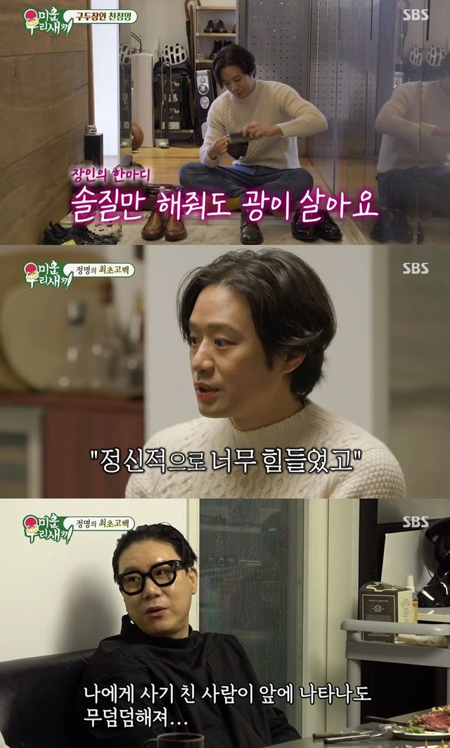 배우 천정명이 근황을 공개했다. 부지런하게 앤티크 가구를 닦던 천정명은 이어 ‘구두 마니아’라는 명성에 걸맞게 다양한 도구를 활용해 구두를 직접 관리하는 장인의 모습을 보였다. 이어 이상민과 김희철이 천정명의 집을 찾았고, 두 사람은 남다른 감각의 인테리어와 멋스러운 앤티크 가구에 감탄사를 연발했다. 담소를 나누던 중 김희철은 “왜 작품을 안 하냐”라고 물었고, 천정명은 “16년을 같이 일한 로드 매니저가 사기를 치며 문제가 커졌다. 그걸 해결하다 보니 많이 지치고 힘들었다. 은퇴까지 생각했다”라고 밝혀 모두를 놀라게 했다.