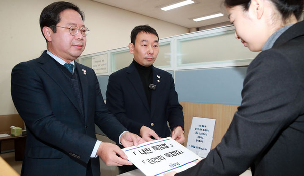 김용민 민주당 원내정책수석부대표와 국회 법제사법위원회 야당 간사인 김승원 민주당 의원은 이날 오전 서울 여의도 국회 의안과를 찾아 '내란 특검법'이라고 명명한 일반 특검법을 제출했다고 밝혔다.