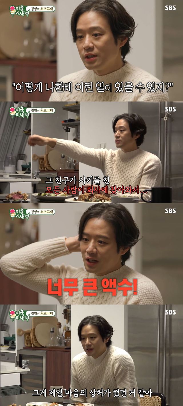 이에 천정명은 "갑자기 사무실에서 급하게 연락이 왔다. 임원분이 연락이 와서 빨리 와달라고. 안 간다고 했더니 그 후에 사장님이 전화가 왔다. 불안해서 부모님이랑 같이 갔는데 현장에는 이미 그 친구가 사기를 친 모든 사람이 회사에 찾아와서 '이거 어떻게 된 거냐' 이러더라"며 자신의 눈앞에 펼쳐졌던 당시의 상황을 상세히 설명했다.