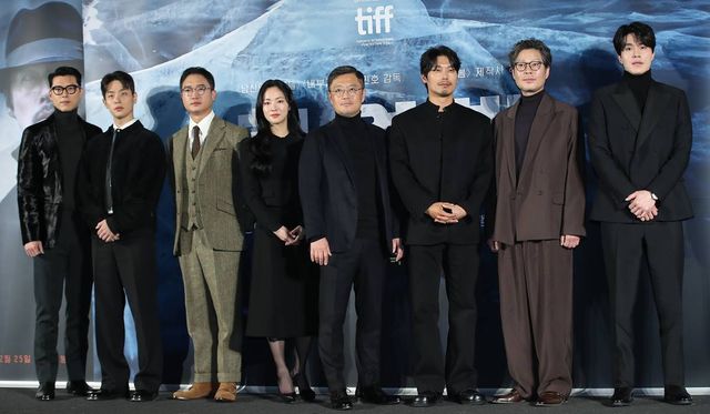 배우 현빈(왼쪽부터)과 박정민, 조우진, 전여빈, 우민호 감독, 박훈, 유재명, 이동욱이 지난달 27일 서울 용산구 CGV용산아이파크몰에서 열린 영화 '하얼빈' 제작보고회에 참석해 포즈를 취하고 있다. '하얼빈'은 1909년, 하나의 목적을 위해 하얼빈으로 향하는 이들과 이를 쫓는 자들 사이의 숨 막히는 추적과 의심을 그린 작품이다 / 뉴스1