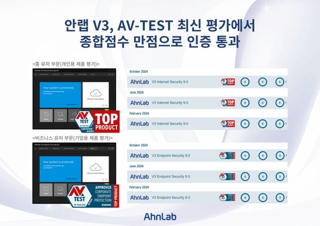 안랩(053800)의 PC용 백신 솔루션 V3가 글로벌 보안제품 성능 테스트인 'AV-TEST'의 2024년 10월 평가에서 종합점수 만점으로 인증을 통과했다.