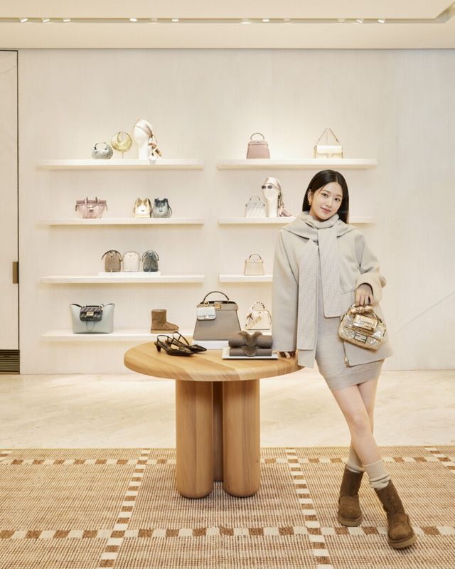 펜디의 신세계 타임스퀘어 부티크에 방문한 안유진은 펜디 2024 윈터 홀리데이 컬렉션의 베이지 컬러 울 재킷과 미니드레스, 겨울 분위기를 자아내는 부츠를 매치해 세련된 스타일을 선보였습니다. 포인트로 샴페인 골드 컬러의 시퀸 장식 펜디 미니 바게트 백을 더해 홀리데이 무드를 완성했죠.