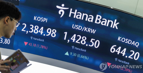 비상계엄 사태를 둘러싼 정치적 불안정에 대한 자본시장의 우려가 현실화하고 있는 9일 오전 서울 중구 하나은행 본점 딜링룸 전광판에 이날 거래를 시작한 코스피와 원/달러 환율, 코스닥 지수가 표시돼 있다. 이날 코스피와 코스닥은 하락 출발했고, 원/달러 환율은 8원가량 오른 1,420원대 후반에서 거래되고 있다. 사진=연합뉴스 제공