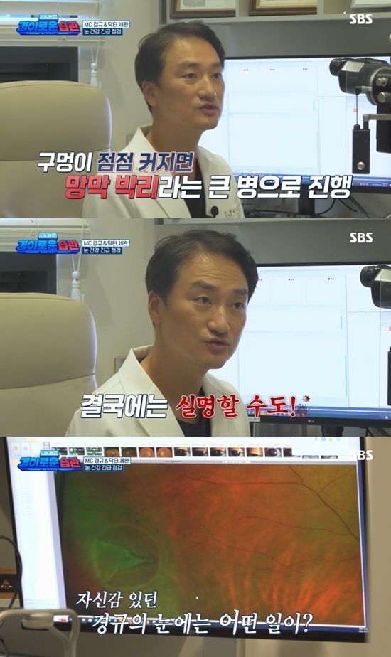 오른쪽 눈 망막 일부에 구멍이 난 사진에 놀란 기색을 감추지 못한 이경규. 그의 진단명은 '망막 열공'이었다. 이번 기회에 발견하지 못했다면 '망막 박리'로 이어져 실명 위험이 매우 높았던 상황.