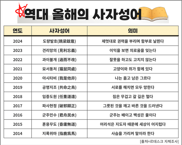 한 해를 마무리하는 매년 연말이면 국민들 사이에서 관심이 집중되는 것이 있다. 바로 '올해의 사자성어'다. 매년 전국 대학교수 1086명을 상대로 교수신문이 추천과 투표를 거쳐 올해의 사자성어를 선정한다. 당대 사회적 갈등, 경제적 위기, 정치적 부조리 등 시대적 상황을 압축적으로 표현하고 있는 게 특징이다.