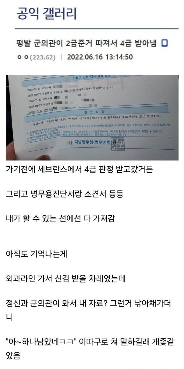 병무청에 ㄱㅈㄹ해서 2급에서 4급 받아낸 디시인.jpg
