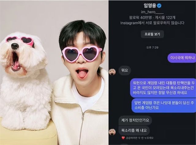 누리꾼은 임영웅에게 "이 시국에 뭐하냐'고 DM을 보냈고, 임영웅은 이에 "뭐요?"라고 답했다. 이어 누리꾼은 "위헌으로 계엄령 내린 대통령 탄핵안을 두고 온 국민이 모여 있는데 목소리 내주는 건 바라지도 않지만 정말 무신경하다. 앞서 계엄령 겪은 나잇대 분들이 당신 주 소비층 아니냐"고 하자 임영웅은 "제가 정치인인가요. 목소리를 왜 내요"라고 답을 해 논란이 됐다.