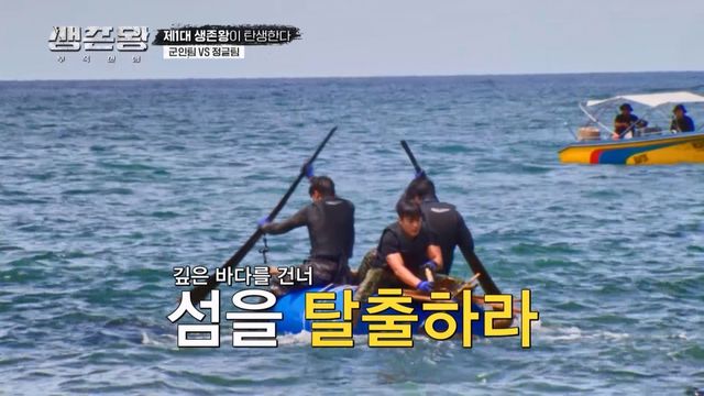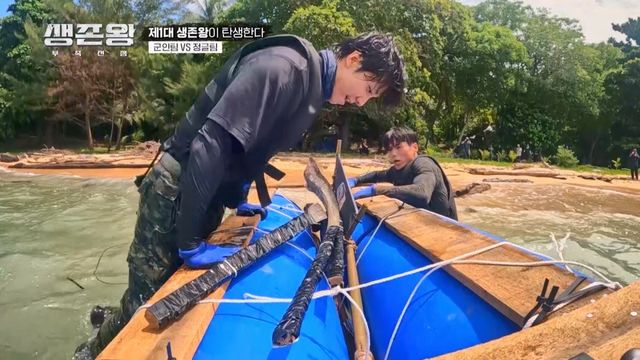 ‘가로 배열’을 떠올렸던 군인팀 강민호는 정글팀의 ‘세로 전략’을 엿본 후, ‘전략왕’ 다운 스피드로 정글팀을 따라하며 뗏목을 제작했다. 시작은 커닝이었지만, 대나무를 선택한 정글팀과 다르게 군인팀은 합판과 드럼통을 끈으로 묶고 못질까지 해 철두철미함과 스피드를 모두 잡았다. 게다가 이승기는 노처럼 생긴 코코넛 야자수의 나무줄기를 챙겨와 팔 길이에 맞게 재단해, 또 한 번 제작 속도에 박차를 가했다.