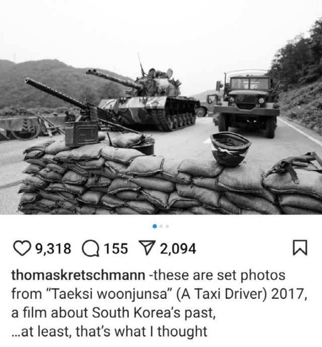 8일(현지시간) 토마스 크레취만은 자신의 인스타그램 계정에 영화 ‘택시운전사’ 세트장 사진과 함께 “한국의 과거를 다룬 영화다. 적어도 나는 그런 줄 알았다”는 글을 게시했다.