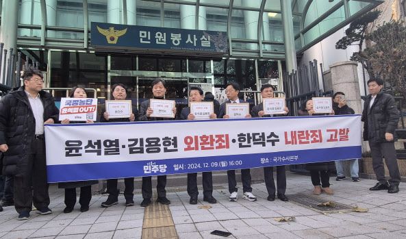 더불어민주당 김병주 최고위원, 박균택·이용우·이태형 법률위원장, 이건태 당 법률대변인 등은 9일 오후 서울시 서대문구 경찰청 앞에서 기자회견을 열고 “평양에 무인기를 투입하고, 오물풍선 살포시 원점타격을 해 북한과 국지전을 도모하려고 한 윤 대통령과 김 전 장관을 외환죄(일반이적죄) 혐의로 고발한다”고 밝혔다.