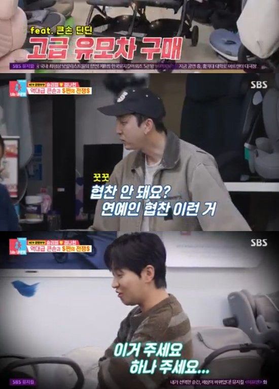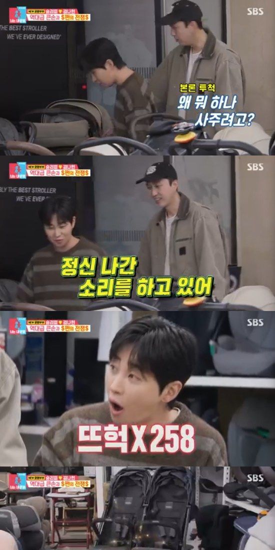 슬리피는 딘딘의 반응에도 가게 사장님께 마음에 드는 유모차 가격을 물어봤고, 가격은 258만원이었다.