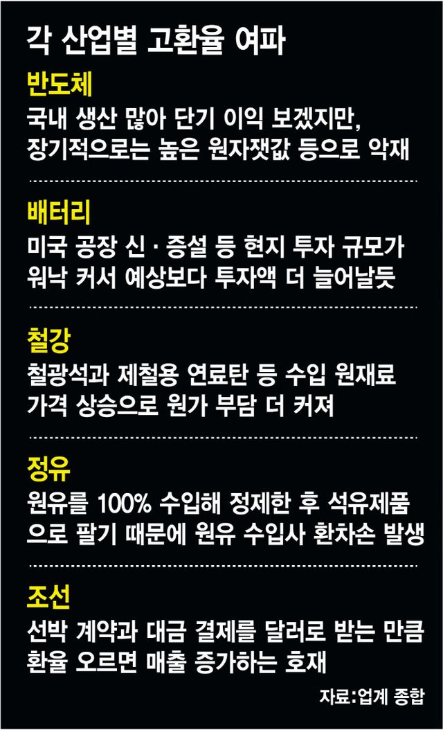 원유를 수입하는 정유업계 역시 고환율은 큰 부담이다. 원유를 100% 수입해 정제한 후 석유제품으로 판매하는 만큼 환율이 오르면 원유를 사들일 때 환차손이 발생하기 때문이다. 철강재 생산에 필요한 철광석과 제철용 연료탄 등의 원재료를 수입하는 철강업계도 마찬가지다. 환율 상승에 따라 원가 부담이 늘어나는 와중에 글로벌 경기 둔화 영향으로 철강 수요가 줄어들면서 원자재 가격 상승분을 온전히 제품 가격에 반영하기 어려운 만큼 손실은 불가피해졌다. 그나마 선박 계약과 대금 결제를 달러화로 받는 조선업계 정도가 고환율이 호재로 작용할 수 있지만, 이 역시 국가 브랜드 저하 리스크에 맞닥뜨릴 경우 추후 여파를 예측하기 어렵다.