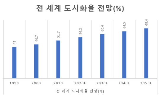 AAM이 미래기술로서 주목받는 건 전 세계적으로 빠르게 진행되고 있는 ‘도시화’로 인한 문제를 해결해줄 수 있는 핵심 기술이기 때문이다. 국제연합(UN)에 따르면 전 세계 도시화율(도시 거주 인구 비중)은 2018년 55.3%에서 2050년에는 68%를 넘어설 것으로 전망되고 있다.