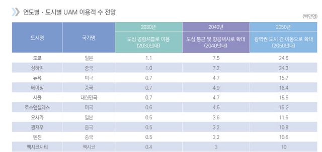 도심 교통난과 환경 오염, 소음 공해 등 문제들을 해소할 수 있는 친환경 차세대 이동 수단으로서 AAM에 대한 기대가 커지면서 앞으로 글로벌 AAM 시장 역시 빠른 속도로 커질 것으로 예상된다. 미국 투자회사 모건스탠리에 따르면 AAM 시장 규모는 상업화 초기인 2030년 3200억달러(약 457조원)에서 2040년에는 1조5000억달러(약 2144조원)까지 커질 것으로 추산됐다. AAM을 이용하는 승객 수는 2040년 1억명을 넘어 2050년에는 4억4500만명까지 급증할 것으로 예상되고 있다. 서울의 이용객 수는 1550만명으로 전망된다.