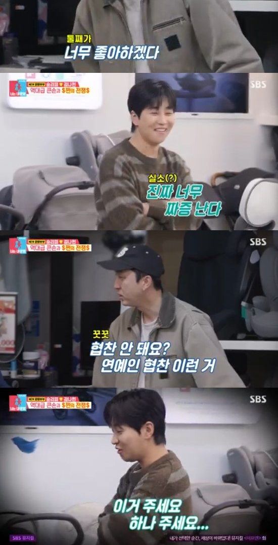 이날 슬리피는 딘딘과 만나 갑자기 가게 안으로 들어갔다. 첫째 딸과 뱁솟에 둘째 아들이 있는 슬리피는 온갖 브랜드의 유모차가 모여있는 숍에 들어가 딘딘이 보는 앞에서 대놓고 구경을 시작했다.