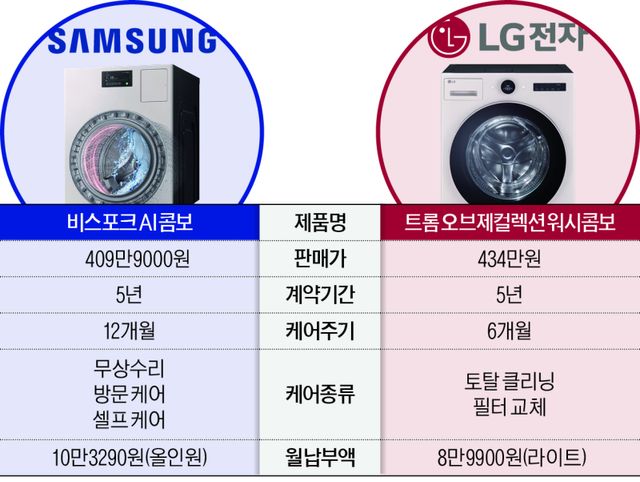 세탁 용량 25㎏, 건조 용량 15㎏의 400만원대 올인원 세탁건조기를 구독할 때 LG전자는 8만9900원, 삼성전자 올인원 요금제는 10만3290원을 납부하도록 안내하고 있다.