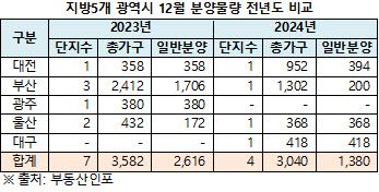 10일 부동산 시장 분석 업체 부동산인포에 따르면 이달 대전, 부산 등 지방5개 광역시에선 4개 단지, 3040가구가 분양에 나설 계획이다. 이중 조합원 몫 등을 제외한 1380가구가 청약통장 가입자에 분양된다(아파트 기준, 임대 제외). 작년 12월 일반에 2616가구가 공급됐다는 점을 고려하면 절반 수준에 그친다.