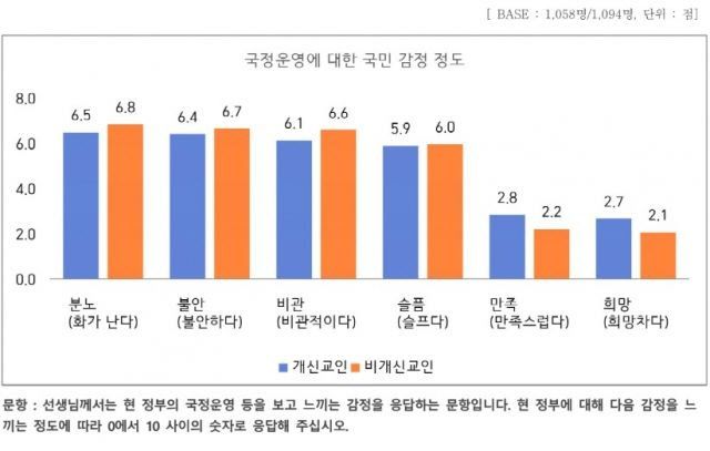 비개신교인을 대상으로 한 설문조사에서도 ‘분노’(6.8점) ‘불안’(6.7점) ‘비관’(6.6점) ‘슬픔’(6.0점) ‘만족’(2.2점) ‘희망’(2.1점) 등의 순서였다.