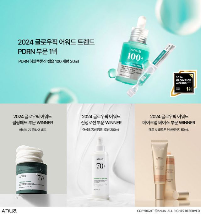 아누아는 이번 글로우픽 어워드에서 PDRN 부문뿐 아니라 필링패드, 진정로션, 메이크업 베이스 등 총 4개 부문에서 수상했다. 특히 어성초 77 클리어 패드는 필링 패드 부문에서 6회 연속 위너로 선정됐다.