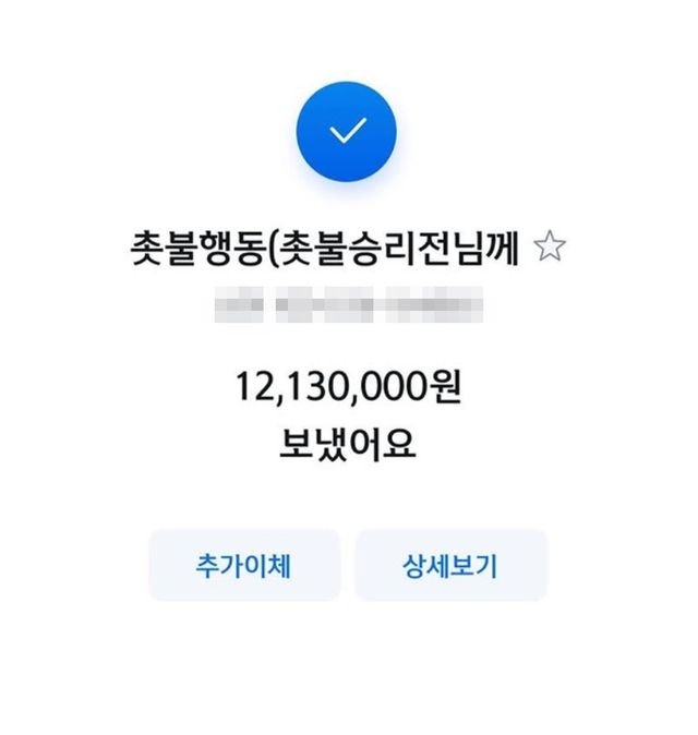 이승환은 촛불집회 등을 개최하며 윤 대통령 퇴진 운동을 주도하는 시민단체 '촛불행동'에 1213만 원을 기부했다며 모바일 뱅킹 송금 캡처 이미지도 공개했다.
