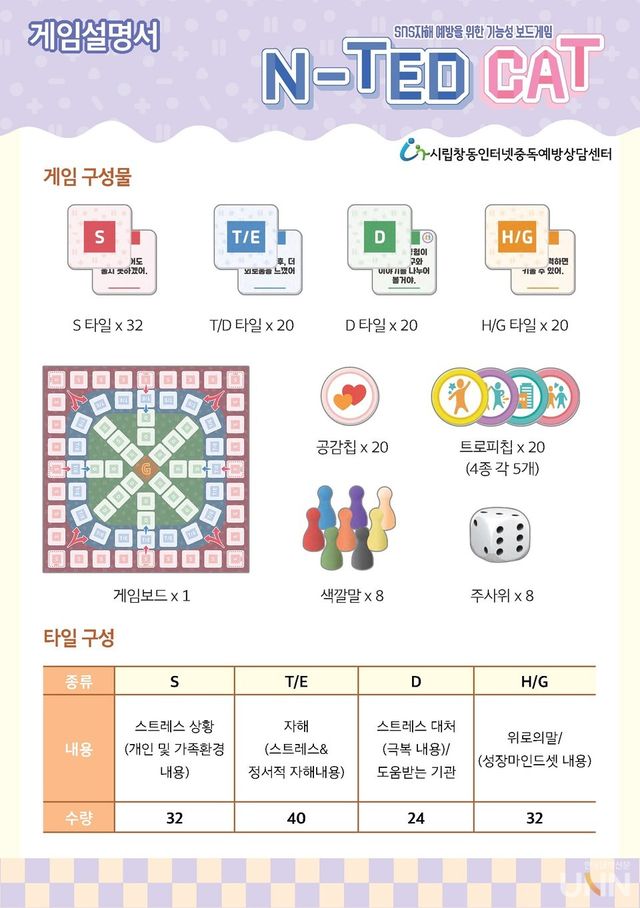 [한국대학신문 이정환 기자] 삼육대학교(총장 제해종)가 수탁 운영하는 서울시립 창동인터넷중독예방상담센터는 청소년 SNS 자해 예방 교육을 위한 기능성 보드게임 ‘N-TED CAT(엔 테드 캣)’을 개발했다.