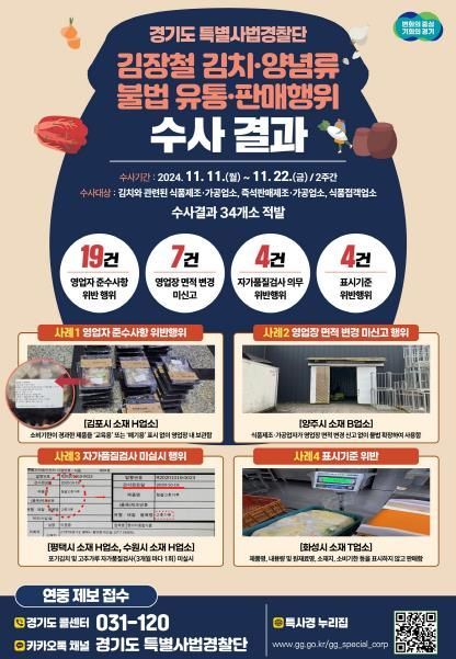 [와이뉴스] 경기도 특별사법경찰단은 김장철 김치·양념류 불법 유통·판매행위를 수사해 김치 제조·가공업소 등에서 영업자 준수사항 위반행위 및 영업장 불법 확장 등 총 34건을 적발했다고 10일 밝혔다.