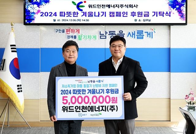[파이낸셜경제=김영란 기자] 인천시 남동구는 위드인천에너지 주식회사로부터 저소득 아동 난방비 지원을 위한 후원금 500만 원을 기탁받았다고 10일 전했다.