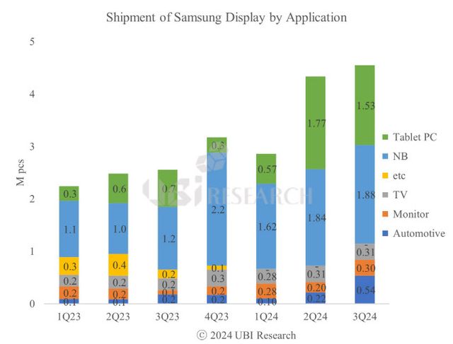 다만 태블릿 이외의 부문에서 성장세를 기록하며 전체 출하량과 매출액이 전분기와 비슷한 수준을 유지한 것으로 유비리서치는 분석했다. 삼성디스플레이는 중대형 OLED로 태블릿 PC뿐만 아니라 노트북과 모니터, 자동차용 OLED까지 다양한 제품을 공급하고 있다.