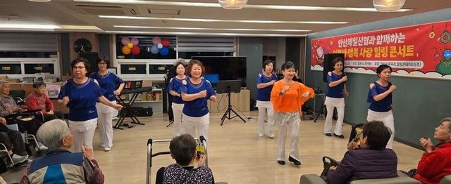 이날 재능기부로 안산시체육회 김현진 사무국장이 사회를 맡았으며 언제나 찾아가는 재능기부를 실천하는 안산제일신협 라온소리합창단 단원들과 이재화 지휘자와 일동행복센터 라인댄스 동아리, 일동 아마존 방송댄스,엘림콘테이너 대표이사인 김구연 조합원의 색소폰연주, 가수 김성 조합원의 노래등 안산제일신협 조합원으로 구성된 공연팀과 함께 연말연시 요양원 어르신들께 행복과 사랑, 따뜻한 온기를 함께 전달했다.