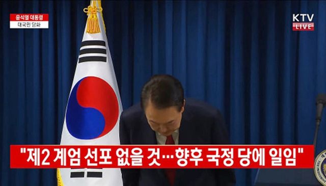 윤석열 대통령이 7일 서울 용산 대통령실 청사에서 계엄 선포 관련 대국민 담화를 마치며 인사하고 있다. / KTV