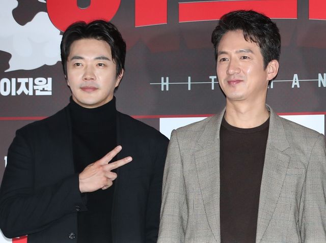 배우 권상우, 정존후(오른쪽)가 2020년 1월 14일 오후 서울 롯데시네마 건대입구점에서 열린 영화 ‘히트맨’ 언론시사회에 참석해 포즈를 취하고 있다. / 뉴스1