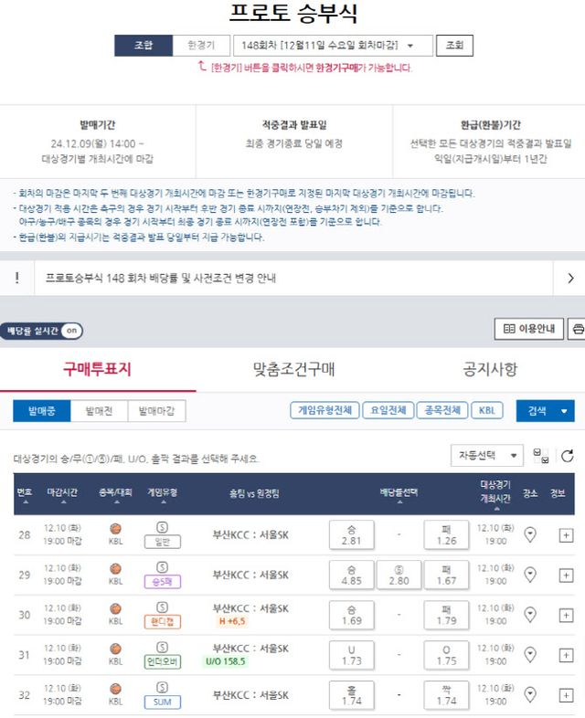 이번 프로토 승부식 148회차에서 부산KCC(홈)-서울SK(원정)전을 대상으로 하는 경기는 △일반(28번) △승5패(29번) △핸디캡(30번) △언더오버(31번) △SUM(32번) 등의 다양한 유형으로 즐길 수 있다.