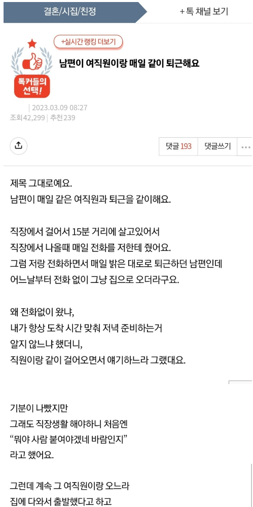 결혼하고나서 한 1년정도 여직원이랑 카풀했는데